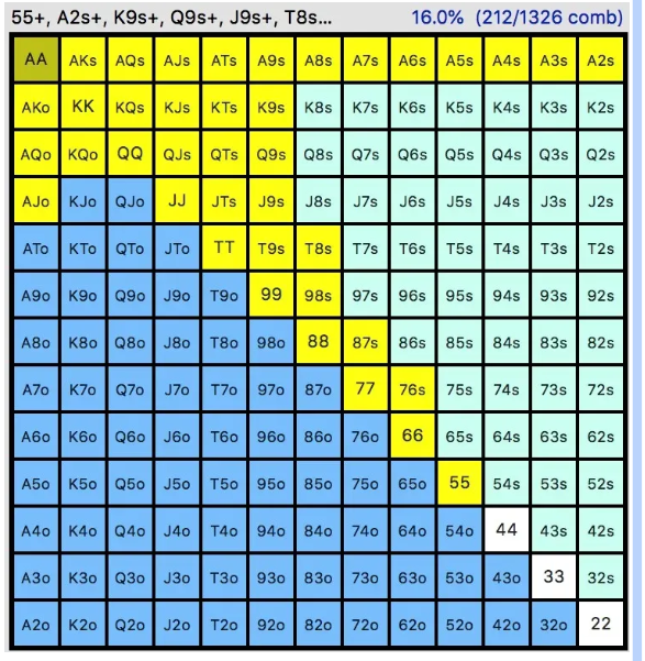 Ved nærmere analyse vil du bemærke, at det udelader nogle hænder fra det første eksempel (ATo, 65s), men i stedet inkluderer hænder som K9s, Q9s, J9s og visse højere suited connectors.